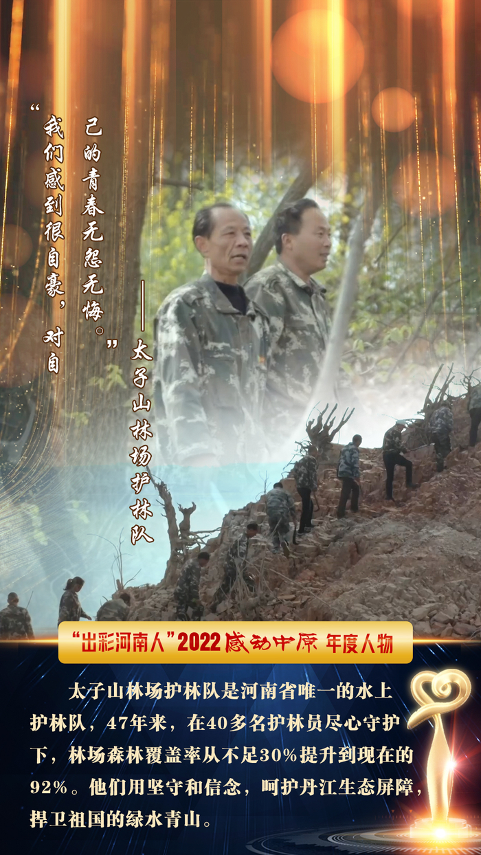 组委会将2022感动中原年度集体奖授予了用48年将荒山变林海、为南水北调中线工程核心水源区构筑起生态净水屏障的南阳市淅川县太子山林场护林队。组委会还对逐梦太空、圆满完成神舟十四号载人飞行任务的河南籍航天员陈冬、刘洋进行了特别致敬。