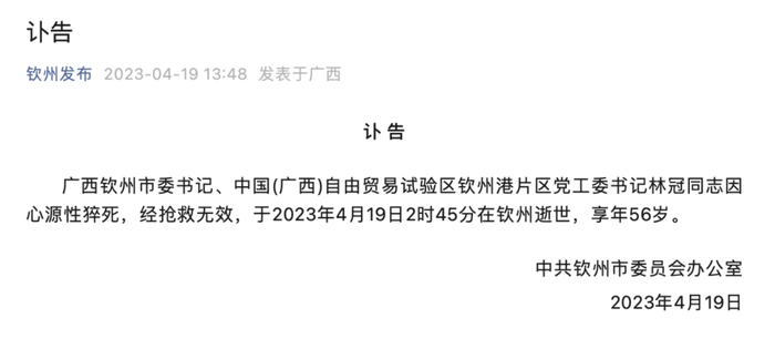 4月19日中午,“钦州发布”发布讣告,称广西钦州市委书记、中国(广西)自由贸易试验区钦州港片区党工委书记林冠同志因心源性猝死,经抢救无效,于2023年4月19日2时45分在钦州逝世,享年56岁。