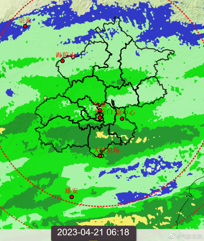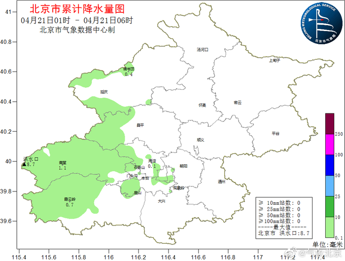 #雨情速递# 市气象台发布21日01时至06时降水量(毫米):全市平均0.2,城区平均(朝,海,丰,石,东,西)0.1,西南(门,房)0.8,西北(延,昌)0.1;城区最大海淀紫竹院0.4,全市最大门头沟洪水口8.7,最大小时降水强度门头沟洪水口7.6毫米/小时(21日03时-04时)。注明:城区(朝阳,海淀,丰台,石景山,东城,西城),西北(延庆,昌平),东北(密云,顺义,平谷,怀柔),西南(门头沟,房山),东南(通州,大兴)