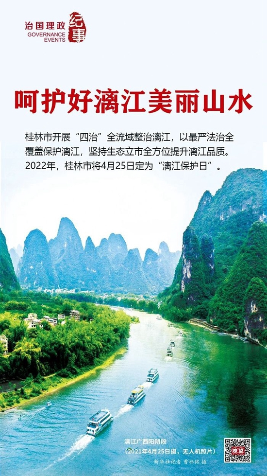 2022年,桂林市将4月25日定为“漓江保护日”。如今的漓江山青水碧,流域森林覆盖率超过80%,干流水质常年保持Ⅱ类标准,漓江入选中国首批美丽河湖治理案例,漓江流域生态文章越做越活,成为人与自然和谐共生的生动注脚。