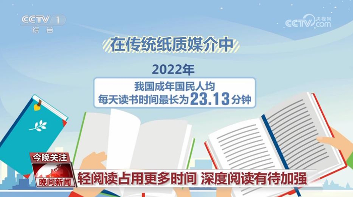 尽管纸质阅读和数字阅读在同步增长,但据调查结果显示,在传统纸质媒介中,2022年我国成年国民人均每天读书时间最长为23.13分钟。而在数字化媒介中,成年国民人均每天手机接触时间最长为105.23分钟,成年国民手机阅读等轻阅读占用阅读时间越来越长,深度阅读仍有待加强。