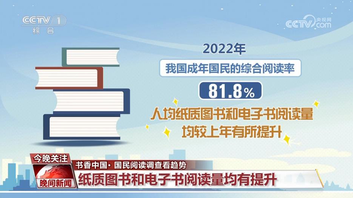 调查结果显示,2022年我国成年国民的综合阅读率为81.8%,人均纸质图书和电子书阅读量均较上年有所提升。其中,人均纸质图书阅读量为4.78本,人均电子书阅读量为3.33本,纸质图书阅读更受欢迎。