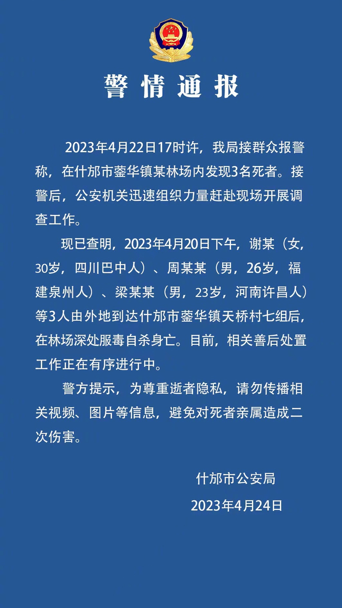[四川什邡#警方通报三人在林场服毒自杀# ]