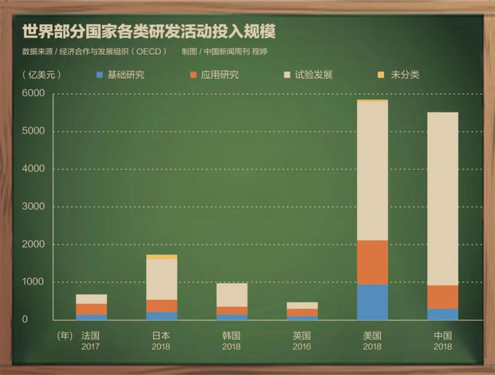 从研发投入总量看,2022年,中国研发经费(R&D)投入规模首次突破3万亿元大关,仅次于美国,位居世界第二。其中,基础研究经费支出为1951亿元,占全部研发经费的比重为6.32%,相较十年前的4.8%,已是一个很大的提升,但仍远低于主要发达国家15%~25%的平均水平。王贻芳认为,中国基础研究的问题,一方面与总体的投入比例不足有关,更关键的症结在于,6.32%的经费也没有得到相对合理的分配,造成经费的使用效益不高。