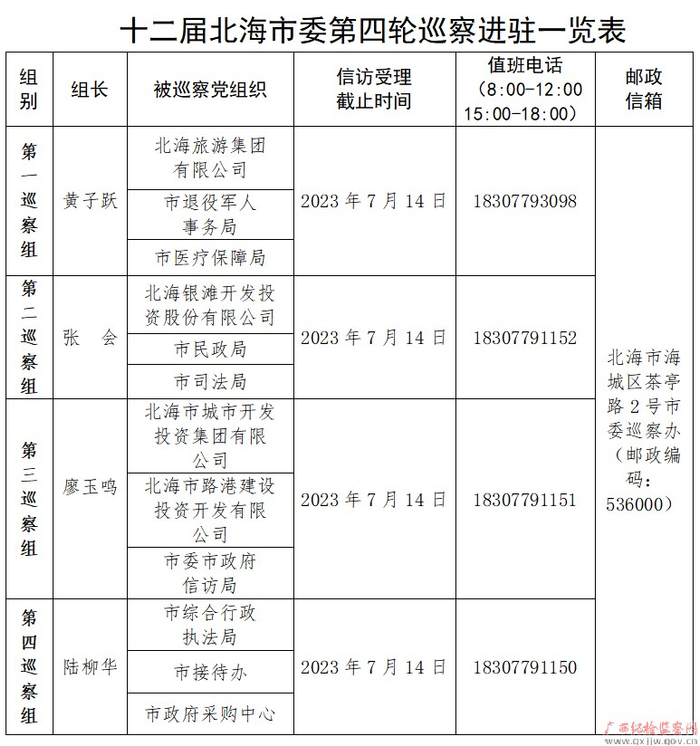 根据北海市委统一部署,截至4月20日,十二届市委第四轮巡察派出的4个巡察组已全部完成进驻,各巡察组将对北海市城市开发投资集团有限公司、北海市路港建设投资开发有限公司等4家市直国有平台企业和市综合行政执法局、市退役军人事务局等8家市直单位党组织开展常规巡察。