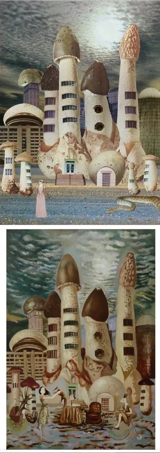 上图为英国艺术家西娜·加文2011年创作的作品《蘑菇城》(图源:西娜·加文个人网站 https://www.seanagavin.com/授权使用)下图为徐跋骋2021年的作品《梦的运动》(图源:互联网)