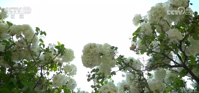 央视网消息:“何人团雪高抛去,冻在枝头春不知”。在江苏苏州,上方山国家森林公园的木绣球花正在盛放。木绣球花期通常在四至五月,花朵初开时为绿色,随后渐渐转为白色,五瓣的小花朵簇成一整个花球,给人一种“满树玲珑雪未干”的美好感受。