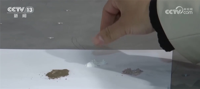 总台央视记者 李晶晶:这是稍微深颜色的,颗粒感比较足,它不是很细。白色有点像爽身粉的感觉,比较细腻。这个稍微有一点点涩的感觉,它颜色更浅,有点偏红,给我们揭开谜底吧。