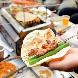 消费者在淄博体验“小饼、小炉加蘸料,灵魂烧烤三件套”。图/IC