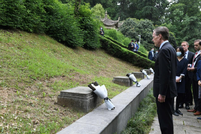 5月11日,伯恩斯又来到南京航空烈士墓,向四位“在二战时期捐躯的美国飞行员”献花。值得注意的是,其中一位飞行员罗伯特·肖特(Robert Short)牺牲于1932年,是中国十四年抗日战争中第一位牺牲的外国飞行员。2014年,罗伯特·肖特被国家民政部收录在第一批著名抗日英烈和英雄群体名录之中。