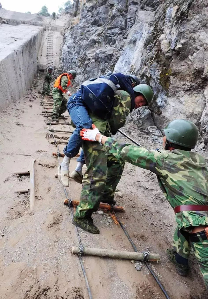 这张照片,记录的是空军官兵冒雨用身体搭建人梯,把伤员从40米高、坡度约60度的断崖上抬下来的难忘瞬间。