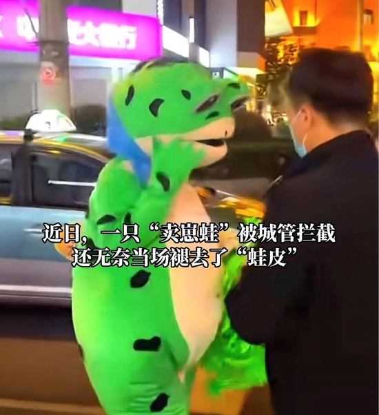 最近,“网红卖崽青蛙上海落网”在网上引起热议。在上海街头,一只“卖崽青蛙”被城管拦截,还无奈当场褪去了“蛙皮”。