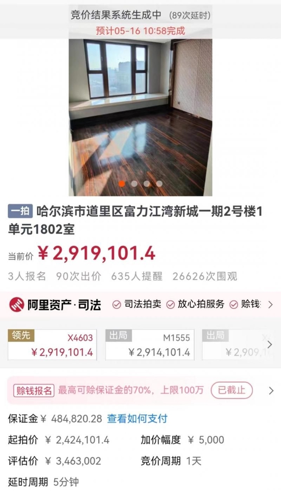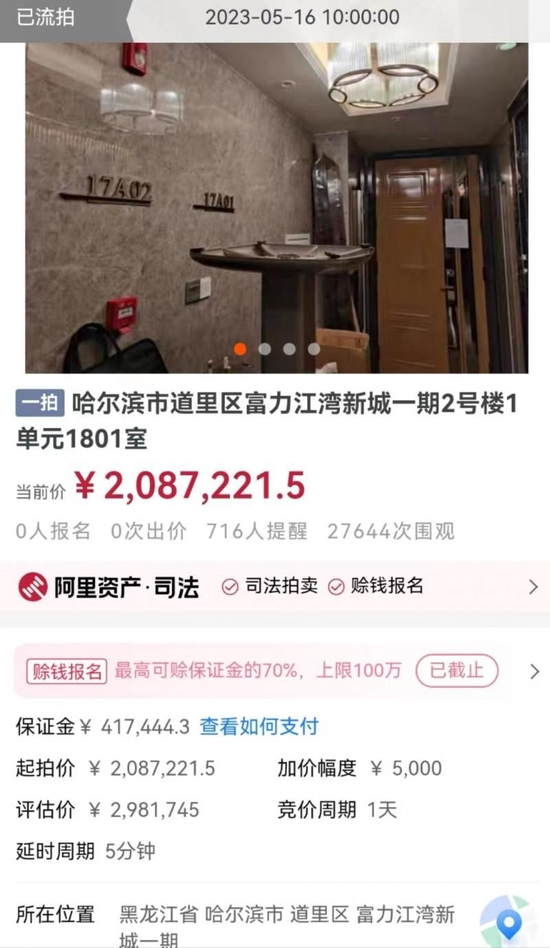 近日,歌手曲婉婷母亲张明杰受贿、滥用职权案迎来新进展,张明杰位于哈尔滨市道里区富力江湾新城一期2号楼1单元的两套房屋于5月15日10时至2023年5月16日10时进行拍卖。拍卖吸引了5万余人围观,千余人提醒,其中1802室有3人报名,经过89次延时,90次出价后以291.9万成交;另一套房屋1801室则因无人报名参拍而流拍。
