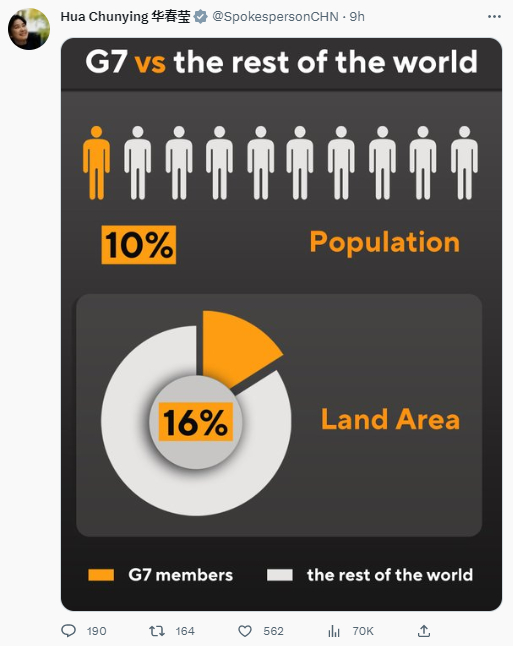 华春莹发的第三张图显示,G7国家的人口总和占世界人口的10%,G7国家的国土面积总和在世界上所占比例为16%。↓