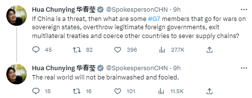 她在第二则帖子中说,“如果中国是一个‘威胁’,那么那些对主权国家发动战争、推翻他国合法政府、退出多边条约和胁迫他国切断供应链的G7成员国是什么?真实的世界不会被洗脑和欺骗”。↓