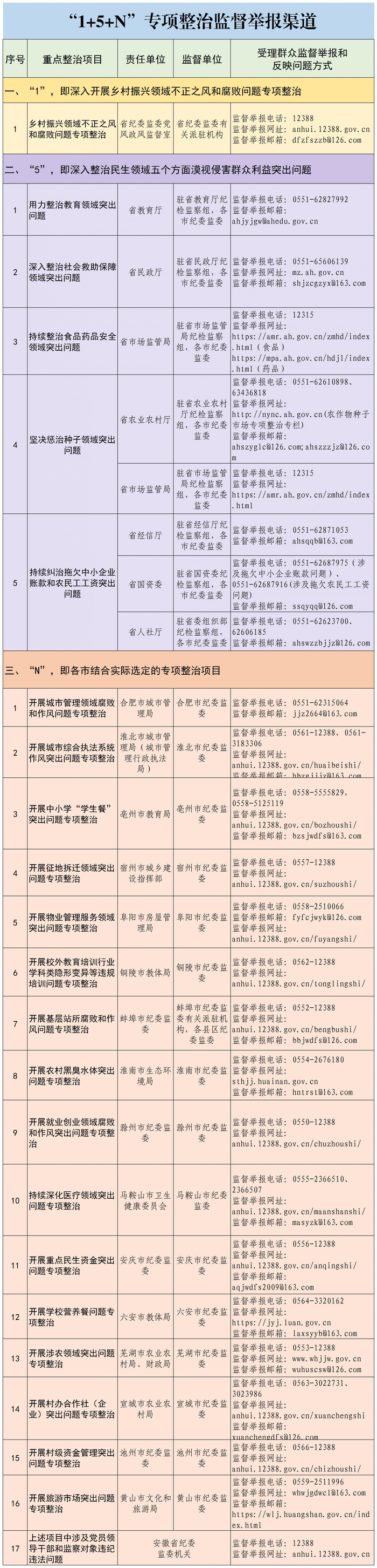 为认真贯彻党的二十大精神,落实中央纪委二次全会“坚决整治各种损害群众利益的腐败问题”及省委有关部署要求,省纪委监委在总结去年针对教育医疗、养老社保、生态环保、安全生产、食品药品安全等民生领域突出问题开展“1+N”专项整治基础上,巩固拓展整治成效,深化开展群众身边不正之风和腐败问题“1+5+N”专项整治,即乡村振兴领域不正之风和腐败问题(为“1”)、民生领域五个方面突出问题(为“5”)作为全省面上整治项目,从各市自选开展的专项整治中,筛选若干项目纳入省纪委监委总体安排中(为“N”),形成“1+5+N”专项整治工作格局。