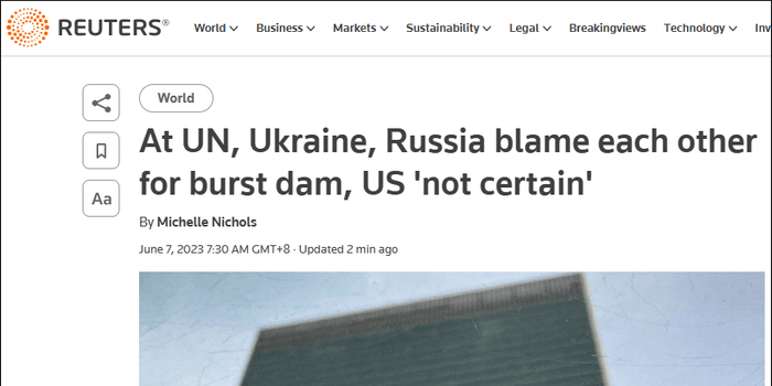 据路透社当天报道,对此事件,美国常驻联合国副代表罗伯特·伍德(Robert Wood)表示,“不确定”哪一方应该为大坝遭破坏负责,但同时称“乌克兰对自己人民和领土作出此事不合理”,暗指认为俄罗斯更有可能是破坏事件制造者。