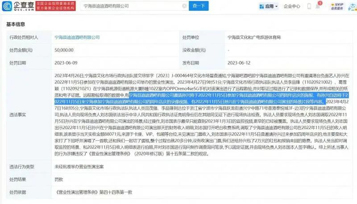 处罚事由显示,执行人员调查发现,当事人曾于2022年11月邀请港台负面艺人孙兴参加其举办的营业性演出。