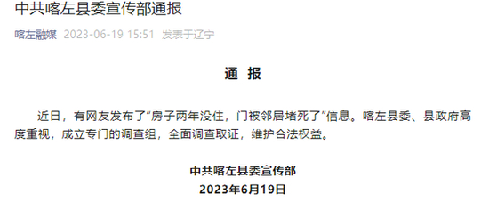 喀左融媒微信公众号消息,6月19日,中共喀左县委宣传部通报,近日,有网友发布了“房子两年没住,门被邻居堵死了”信息。喀左县委、县政府高度重视,成立专门的调查组,全面调查取证,维护合法权益。