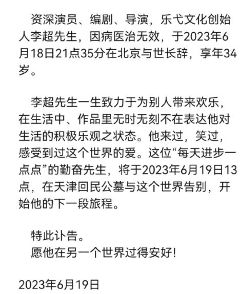 北京乐弋文化传媒有限公司发布的讣告称,李超先生一生致力于为别人带来欢乐,在生活中、作品里无时无刻不在表达他对生活的积极乐观之状态。他来过,笑过,感受到过这个世界的爱。愿他在另一个世界过得安好!