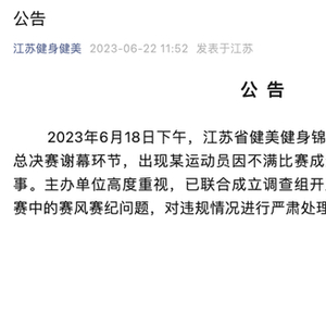 6月20日,有网友爆料称在2023年江苏省健美健身锦标赛上,一女选手在台上将高跟鞋脱下扔向评委席。22日,江苏省健身健美运动协会通报:2023年6月18日下午,江苏省健美健身锦标赛女子健身模特全场冠军总决赛谢幕环节,出现某运动员因不满比赛成绩,在舞台上丢鞋砸裁判一事。主办单位高度重视,已联合成立调查组开展工作,将依规依纪调查比赛中的赛风赛纪问题,对违规情况进行严肃处理。