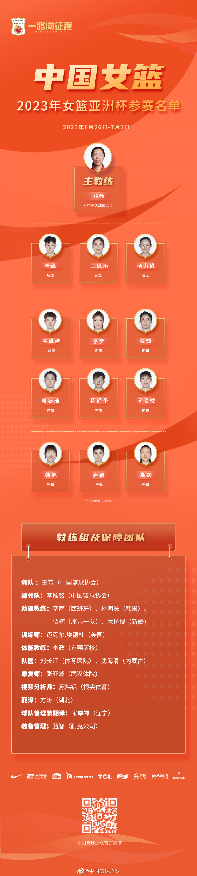 6月25日,据@中国篮球之队 消息,2023年女篮亚洲杯中国女篮参赛大名单出炉,李梦、韩旭、王思雨领衔。本届女篮亚洲杯将于6月26日-7月2日在澳大利亚悉尼举行,获得前四名的队伍将取得2024年巴黎奥运会资格赛的参赛资格。本届亚洲杯上,中国队与黎巴嫩队、新西兰队和韩国队一同被分在A组。北京时间明天中午11点30分,中国队将迎战小组赛第一个对手黎巴嫩队。