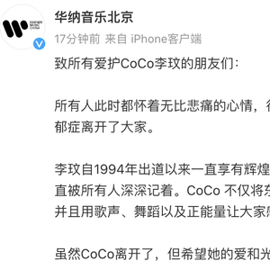 李玟的音乐代理公司华纳音乐通过微博确认了这一噩耗并表示悼念。