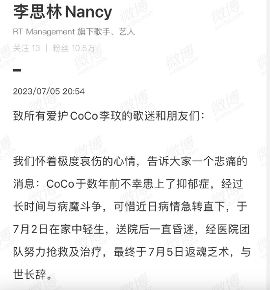 今天,根据歌手李玟的姐姐在微博发文,李玟数年前患抑郁症,经过长时间与病魔斗争,于7月5日返魂乏术,与世长辞。