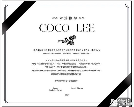 7月6日,李玟老公Bruce与李玟两位家姐一同发出讣告,文中提到:“我们谨以万分悲痛和不舍的心情通告:经过与抑郁症的长期斗争,李玟CoCo于2023年7月5日离世,享年48岁,全部家人陪伴在侧。CoCo是一位内外美丽兼备,温暖和善良的人。她是一位全能的唱作歌手,一位才华洋溢的表演者,一位关心年轻一代的导师,挚爱的妻子、深受爱戴的朋友及亲爱的家庭成员。她的热忱和真诚为身边每个人带来阳光。她所触动的许多生命将深深地怀念她。她的影响力和光芒将永远持续下去。葬礼细节待定,容后公布。”