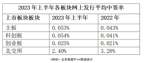 从各板块来看,今年上半年主板的平均中签率为0.053%、科创板为0.054%、创业板为0.025%。三个板块的中签率相较2022年都有所提升。相比之下,北交所的中签率有所降低。上半年,北交所中签率为2.40%,而其2022年中签率为3.28%。