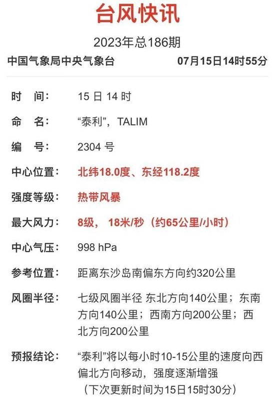 中央气象台7月15日14时55分台风快讯,改称“泰利”
