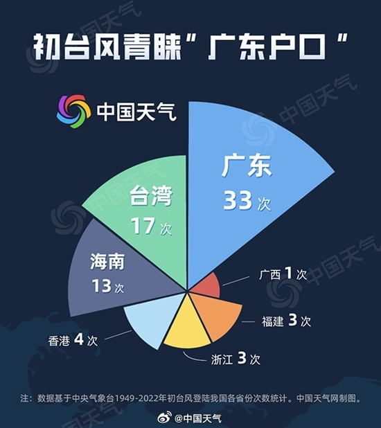 不过,从登陆地来看,“泰利”仍然拥有了初台风最偏爱的广东“户口”。历史数据显示,北至浙江宁海到三门一线,南达海南三亚,均能“捕捉”初台风的身影。而广东作为初台风登陆点的次数则遥遥领先,达到33次,是第二名台湾登陆次数的近两倍。