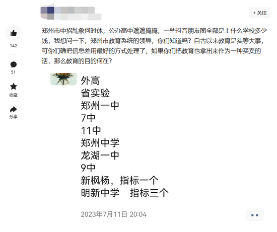 7月17日,郑州市教育局宣传外事处处长闫曦致电顶端新闻记者,要求删除群众留言:“初中和小学招生阶段,类似信息不要放出来”,“会回复,但不是现在”。