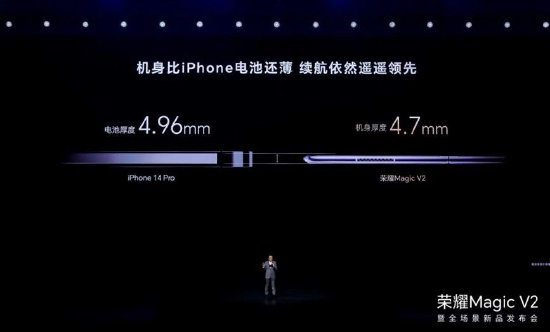这个数据,不仅全面领先于华为Mate X3(羽砂版)的241克,更是比直板旗舰iPhone14 Pro MAX(240克)还要轻;并且如果你两只手各拿着荣耀Magic V2和iPhone14 Pro进行横截面对比,就会发现,荣耀Magic V2的机身比iPhone的电池还要薄,真正意义上实现了折叠屏手机的“毫米级”进化。