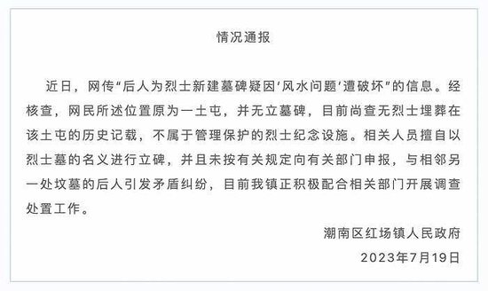 据广东省汕头市潮南区委宣传部官微,7月19日,潮南区红场镇人民政府发布情况通报:近日,网传“后人为烈士新建墓碑疑因‘风水问题’遭破坏”的信息。经核查,网民所述位置原为一土屯,并无立墓碑,目前尚查无烈士埋葬在该土屯的历史记载,不属于管理保护的烈士纪念设施。相关人员擅自以烈士墓的名义进行立碑,并且未按有关规定向有关部门申报,与相邻另一处坟墓的后人引发矛盾纠纷,目前我镇正积极配合相关部门开展调查处置工作。