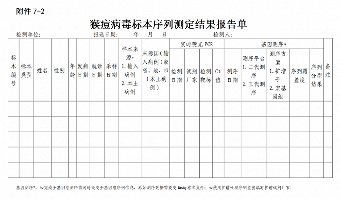 各省应建立本省输入、本土病例猴痘病毒基因组数据库,应具备序列对比分析能力。具备测序条件的省份要在接收标本后48小时内开展测序工作,关键样本要求实验室收到标本后1周内提供测序结果报告,所有测序原始数据(一般为fastq格式)、组装序列(一般为fasta格式)和标本序列测定结果报告单(见附件7-2)应在获得序列48小时内报送中国疾控中心病毒病所进行序列汇总、分析。病毒病所应将序列分析结果及时反馈各省,并将全国猴痘病毒序列汇总、分析结果及时上报国家疾控局。