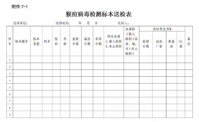 1。送检标本:病例标本先由省级及以下疾控机构进行初步检测,各省首例猴痘阳性标本应送中国疾控中心病毒病所复核。每个阳性病例至少采集一套标本(皮肤或黏膜病变部位标本、口咽拭子标本及急性期、恢复期双份血清标本)送中国疾控中心病毒病所检测。各省级疾控机构根据实际情况制定省内样本送检、复核流程。