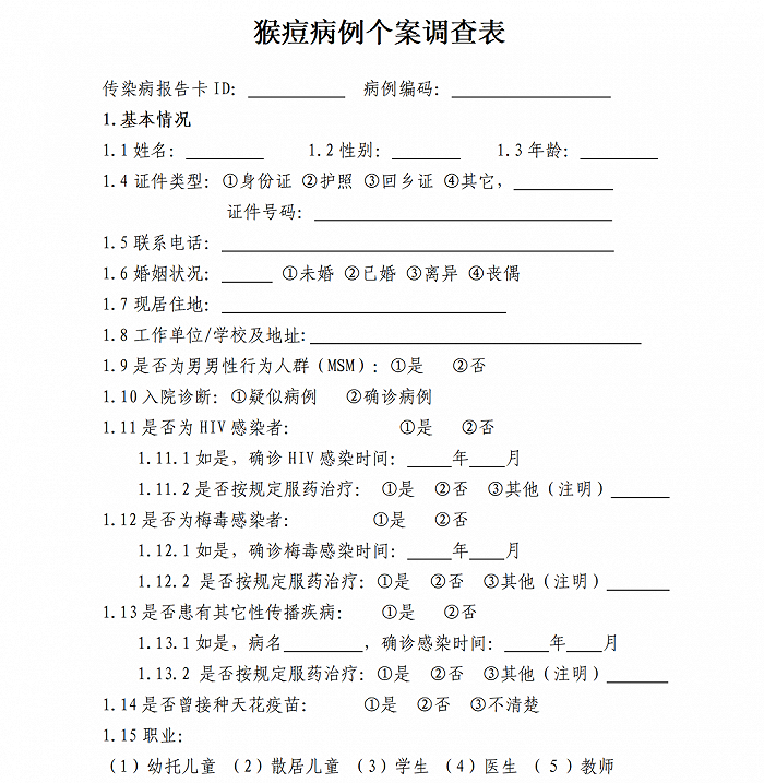 调查内容主要包括病例基本信息、发病就诊情况、临床表现、转归及实验室检测;发病前21天内与可疑感染来源的接触史、接触场所及接触方式;发病后至隔离治疗前的具体活动地点、与其有皮肤或黏膜直接接触者,以及发病前4天内与其有性接触者。