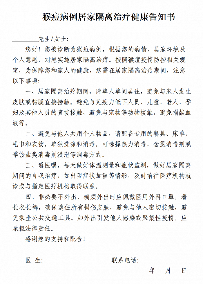 各地发现猴痘疑似病例和确诊病例应当及时转运至医疗机构进行隔离治疗,如临床症状明显好转,病变部位已结痂,可转为居家隔离治疗,直至皮疹结痂自然脱落,解除居家隔离。对病情较轻且具备居家隔离治疗条件的确诊病例,经医疗机构与疾控机构联合评估后,可直接采取居家隔离治疗。对于实行居家隔离治疗的确诊病例发放《猴痘病例居家隔离治疗健康告知书》(见附件2)。确诊病例居家隔离治疗期间,单人单间居住,避免与家人有皮肤或黏膜直接接触,做好被污染物品的消毒,非必要不外出,确须外出时穿长衣长裤、佩戴医用外科口罩,避免前往人群聚集场所,避免与其他人有皮肤或黏膜直接接触;指定医疗机构安排专人负责上门或电话随访,提供健康咨询和医疗指导。