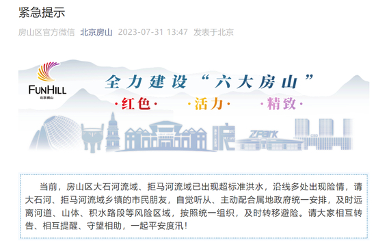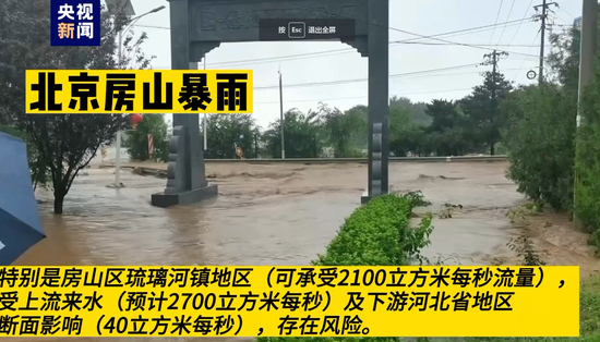 目前北京多地仍在暴雨红色预警中,房山区大石河流域漫水河断面将出现红色预警标准洪水。