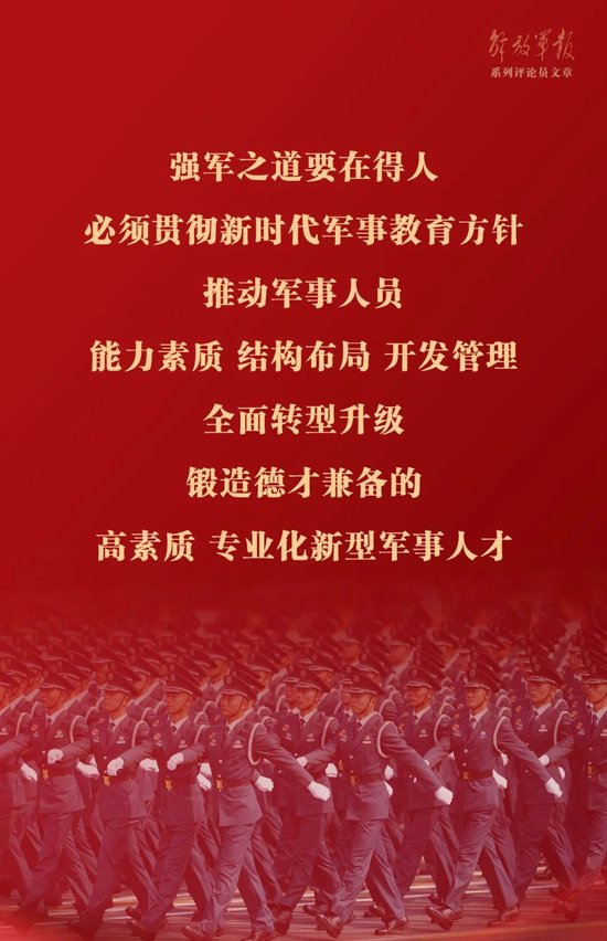 “强军之道要在得人,必须贯彻新时代军事教育方针,推动军事人员能力素质、结构布局、开发管理全面转型升级,锻造德才兼备的高素质、专业化新型军事人才”。习近平强军思想这一重要内涵,深刻回答了强军兴军的根本大计这个重大问题。