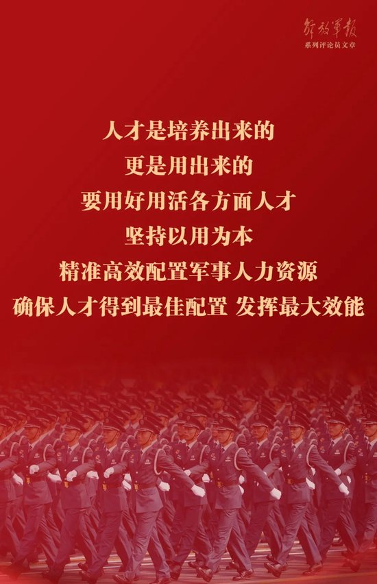 人才是培养出来的,更是用出来的。要用好用活各方面人才,坚持以用为本,精准高效配置军事人力资源,确保人才得到最佳配置、发挥最大效能。坚持分类施策,抓好联合作战指挥人才、新型作战力量人才、高层次科技创新人才、高水平战略管理人才培养使用,发挥好军士和文职人员作用。