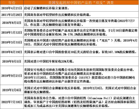 公开报道显示,由于铝在航空、新能源、军工等关键领域的应用,美国将铝行业视为影响国家安全的战略行业。自2017年起,美国政府对来自中国的铝和铝制品进行了密集性打压:除对中国铝箔、铝板带、铝挤压材等三大类铝材加征高额反倾销税和反补贴税外,还对中国铝制品加征10%关税,并对中国铝制品启动232条款、332条款以及301条款调查。
