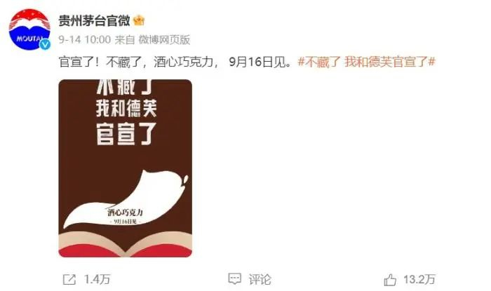 茅台与瑞幸联名的“酱香咖啡”引发的现象级热度还未消散,茅台很快又官宣了下一位“新欢”:9月14日,德芙、贵州茅台官方微博相继宣布,将在9月16日推出茅小凌酒心巧克力新品。