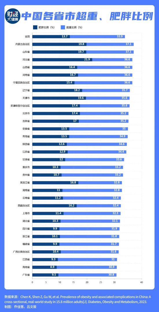 内蒙古、山东和河北的超重、肥胖率最高