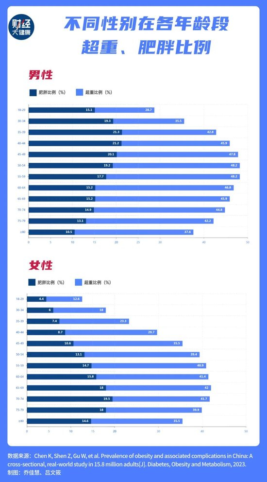 值得注意的是,新《真实世界研究》报告的另一组数据显示,中国超重和肥胖的男性比女性更普遍,男性超重的人群占比已经高达41.1%,肥胖率也有27.7%,女性相对低很多,超重占比18.2%,肥胖率9.4%。