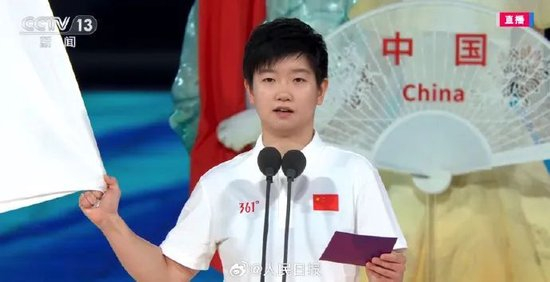 中国羽毛球运动员郑思维、乒乓球运动员孙颖莎,代表全体运动员宣誓。值得注意的是,二人是用英文宣誓的。
