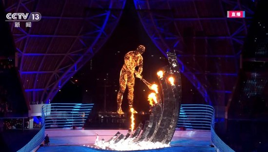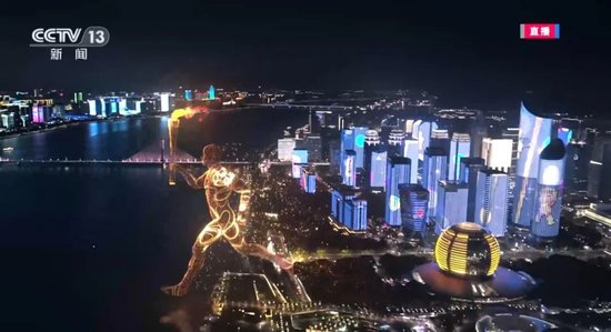 开幕式现场,内场火炬手叶诗文、樊振东、徐梦桃、石智勇、李玲蔚、汪顺依次传递火炬。与此同时,承载着全亚洲亿万人热情的“数字火炬手”跨越钱塘江,奔跑而来。