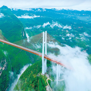 一座座大桥,跨越山河,将天堑变通途。重峦叠嶂、沟壑纵横的贵州,由于独特的自然地貌,是世界上特大峡谷桥分布最密集、数量最多的地区。世界前100座高桥中,有近一半在贵州。位于贵州关岭布依族苗族自治县的坝陵河大桥,全长2237米、桥面距水面高达370米,是世界首座千米级山区钢桁梁悬索桥;横跨黔南州槽渡河峡谷两岸的平塘特大桥,桥体采用造型优美的空间钻石形索塔,桥下河面最宽处达到百米,被称为“天空之桥”;正在建设的六安高速花江峡谷大桥,全长2890米,主桥跨径1420米,桥面与水面垂直距离达625米,建成后将成为山区第一跨、世界最高桥……“万桥飞架”构筑起贵州一座座崭新的物理地标,更是迈向中国式现代化进程中一个个响亮的音符。
