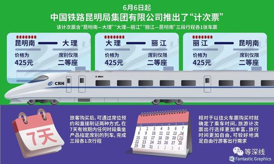 今年6月6日,中国铁路昆明局集团有限公司推出昆大丽旅游计次票,产品定价为425元,产品包含“昆明(昆明南)—大理”“大理—丽江”“丽江—昆明(昆明南)”三段行程各1张二等座车票。这是国铁集团首次推出不同线路的计次票。这三段单独购票乘车的票价为445~466元,425元的套票可以便宜20~41元,被不少网友调侃“20元的诚意,没意思”。